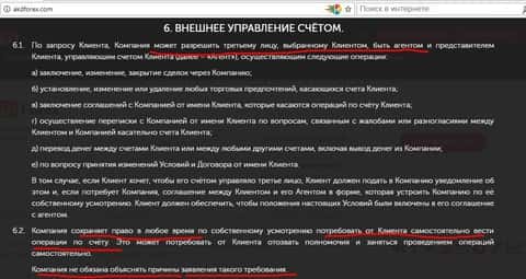 В клиентском соглашении дилингового центра АKD Forex есть интересный раздел под номером 6. Внешнее управление торговым счетом. С одной стороны неопытному трейдеру пунктом 6.1 вроде бы позволено отдавать свой торговый счет в управление профессионалу. Но, с другой стороны, кухня АKD Forex в любой момент может отменить эту норму без объяснения причин, ссылаясь на пункт 6.2 Условий проведения операций. На самом деле все очень просто. Поскольку финансовый аферист АKD Forex является типичной кухней, то ему крайне не выгодны успешные трейдеры. И, если доверенное лицо клиента торгует в профит, то нужно такую возможность у клиента отнять. Самостоятельно быстрее сольется.