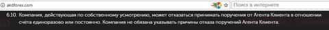 В закрепление предыдущей нормы брокер-аферист АКД Форекс пунктом 6.10 клиентского соглашения ставит агента трейдера в абсолютно бесправное положение. Оказывается, дилинг АКД Форекс имеет полную власть отказать агенту в открытии любой сделки. И, опять же, без объяснения причин.