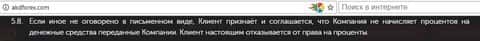 Получив в полное распоряжение деньги трейдера сразу после открытия последним торгового счета, кухня АКД Форекс имеет наглость требовать от трейдера отказа от положенных в таких случаях процентов. И закрепляет эту норму пунктом 5.8 клиентского соглашения.