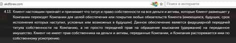 Абсолютно ничего не стесняясь дилинговый центр АKD Forex присваивает деньги собственных клиентов, опираясь на пункт 4.13 клиентского соглашения. Принимая Публичную оферту брокера-мошенника АKD Forex, трейдер изначально отказывается от всех средств, переведенных на торговый счет компании-мошенника.