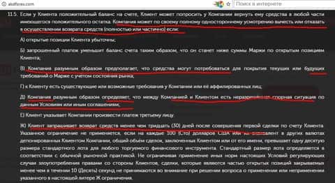 Очень интересен пункт 11.5 Условий торговых операций кухни АКД Форекс. Здесь прописаны лазейки, согласно которым брокер-мошенник АКД Форекс имеет полное право не выплачивать личные средства трейдера.