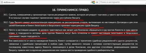 Достаточно издевательски изложена глава 16 клиентского соглашения дилингового центра АКД Форекс. Согласно этой главе всем обманутым трейдерам придется обращаться в суд далекого островного государства Вануату, расположенного в Океании, куда самый скромный авиабилет эконом-класса стоит не менее 2 000 американских долларов. При этом, если сам хитрый брокер решит в судебном порядке преследовать трейдера, то делать он это будет по месту жительства последнего.