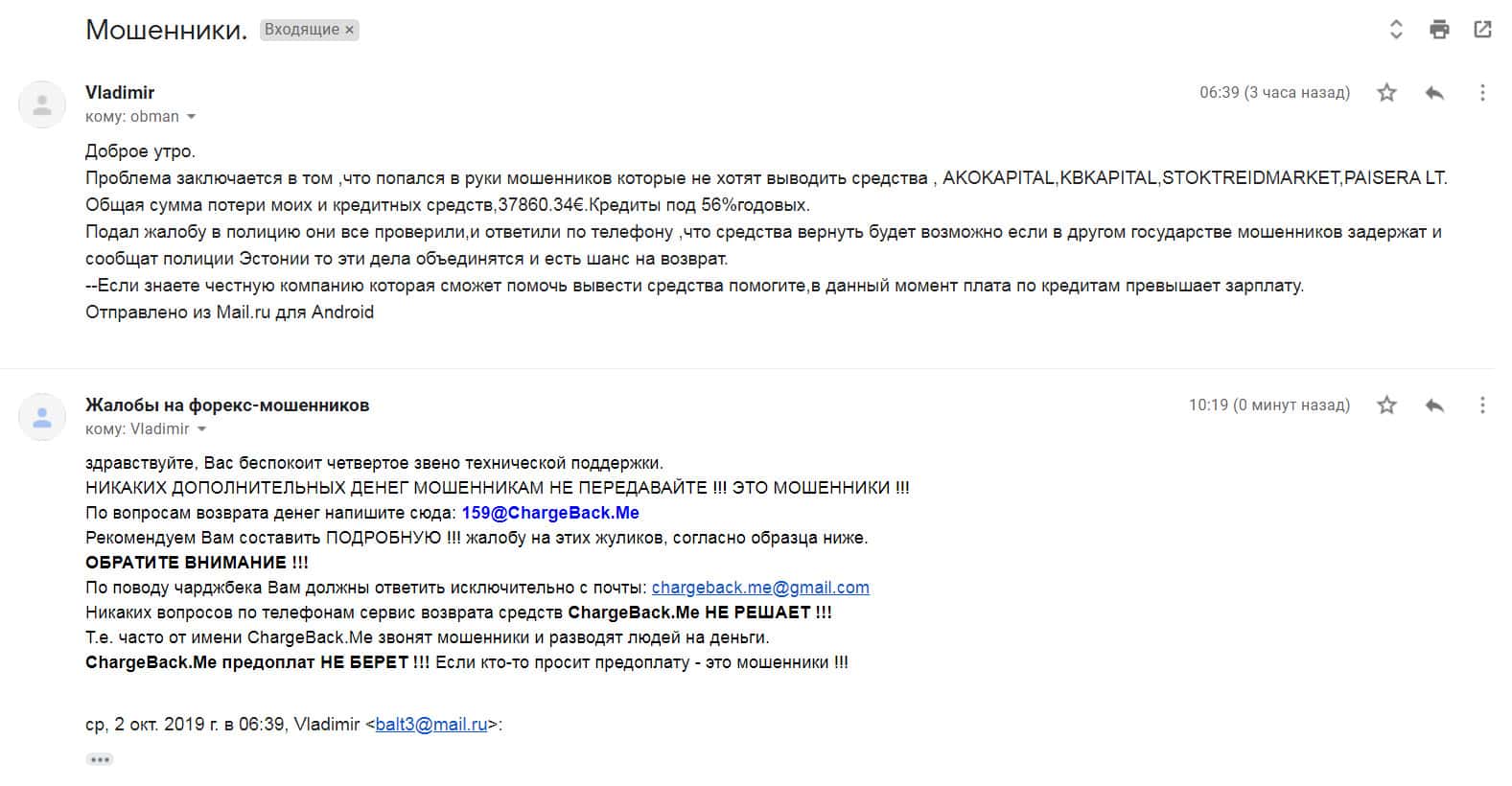 Письмо пришло от одного страждущего человека, который попался на удочку сразу в несколько мошеннических контор, а именно: АКО Капиталс, КБ Капиталс, СтокТрейдМаркет и Пайсера ЛТ. Жулики вытащили почти 38 000 евро, которые клиент взял в кредит под 56% годовых. Теперь остается надеяться только на полицию.