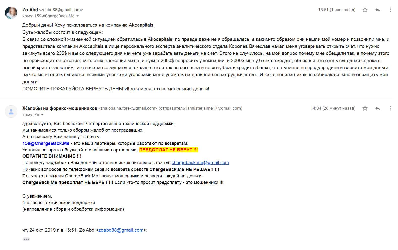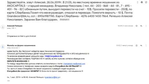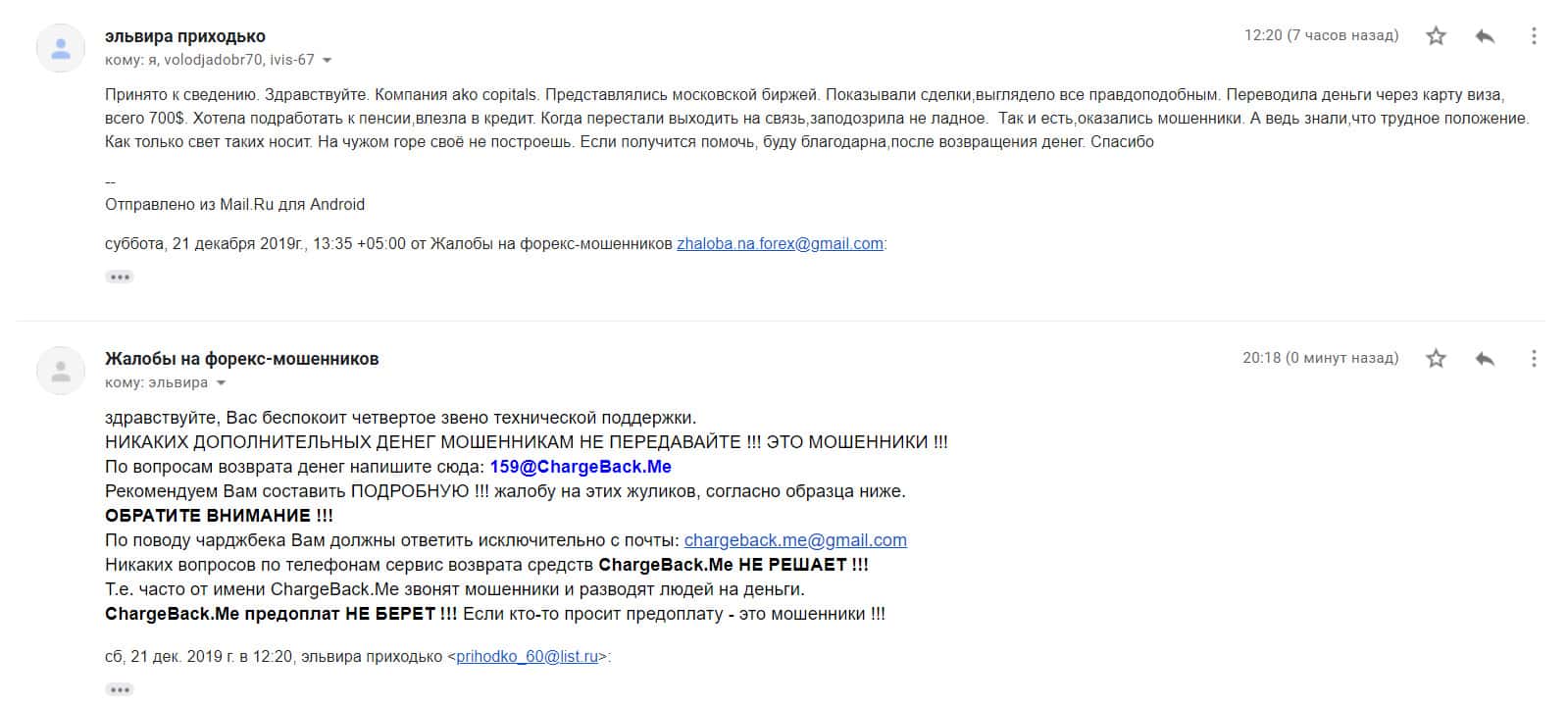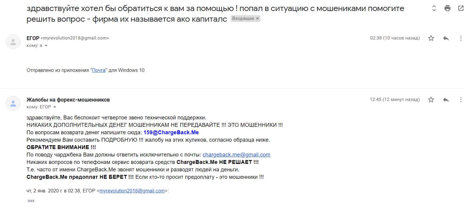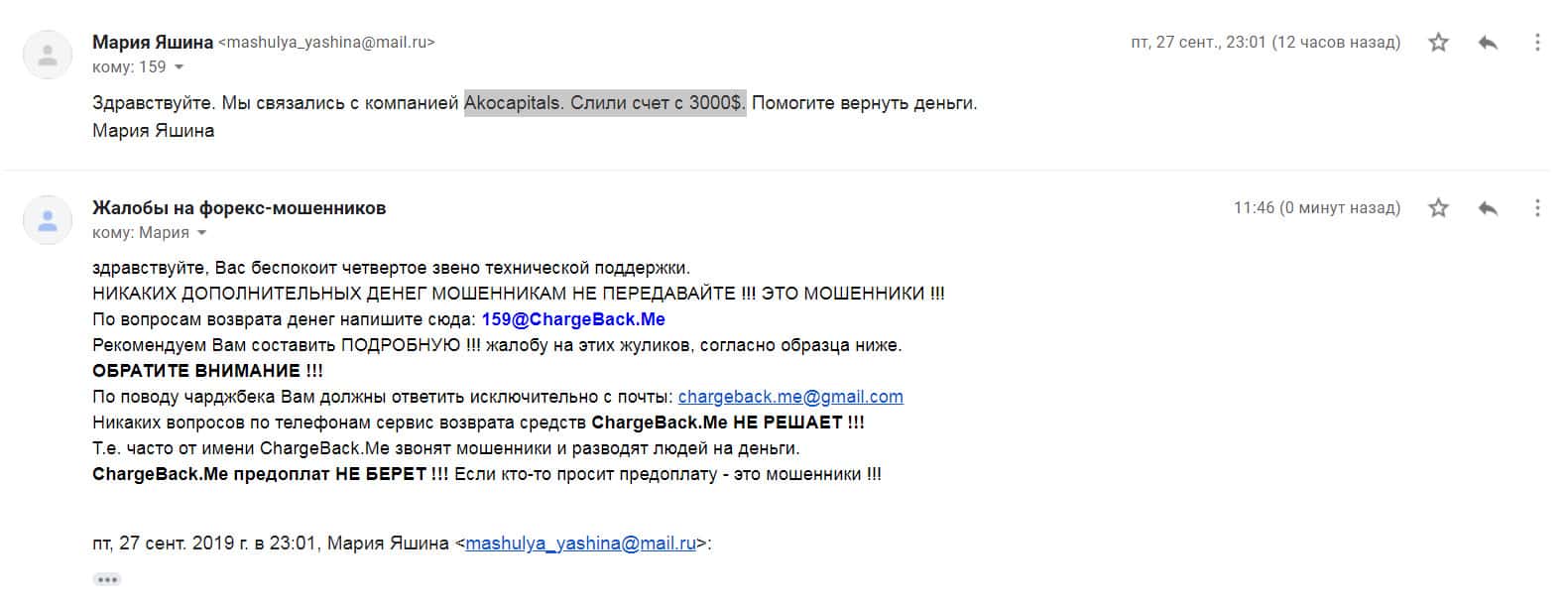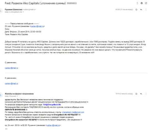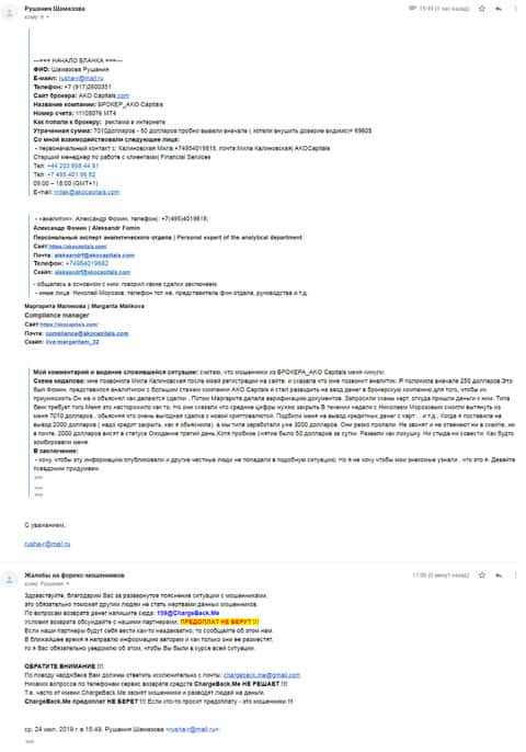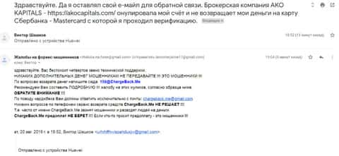 Далее представлен скриншот письма, в котором мы видим как клиент прикрепил подробную жалобу на лохотрон AKoCapital.