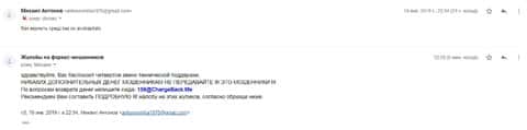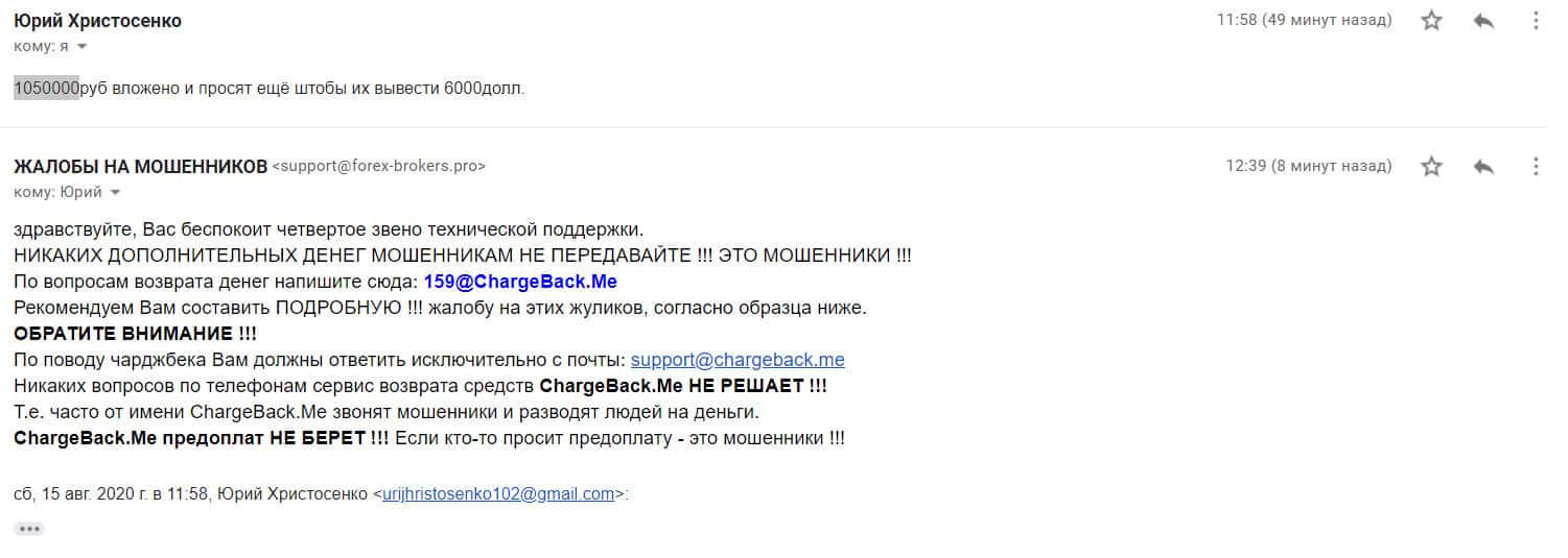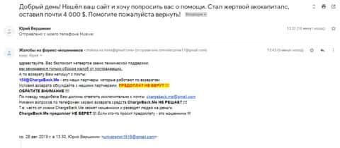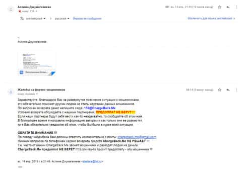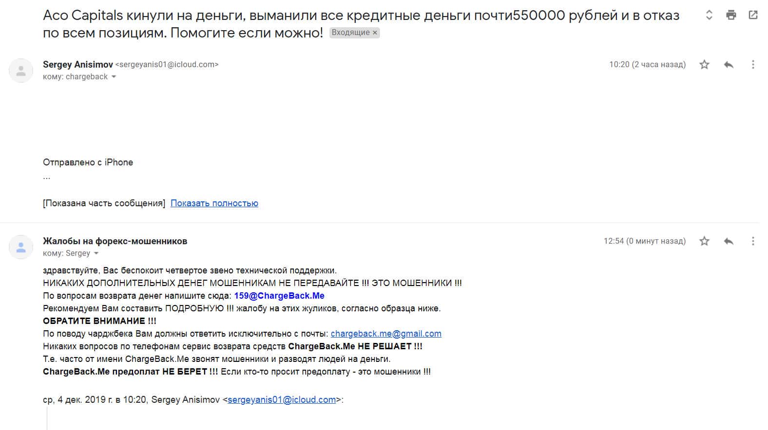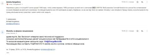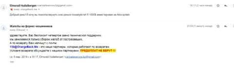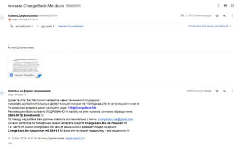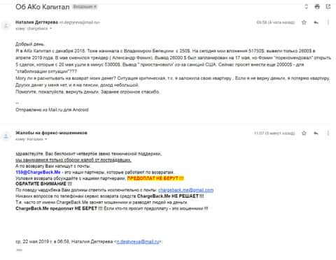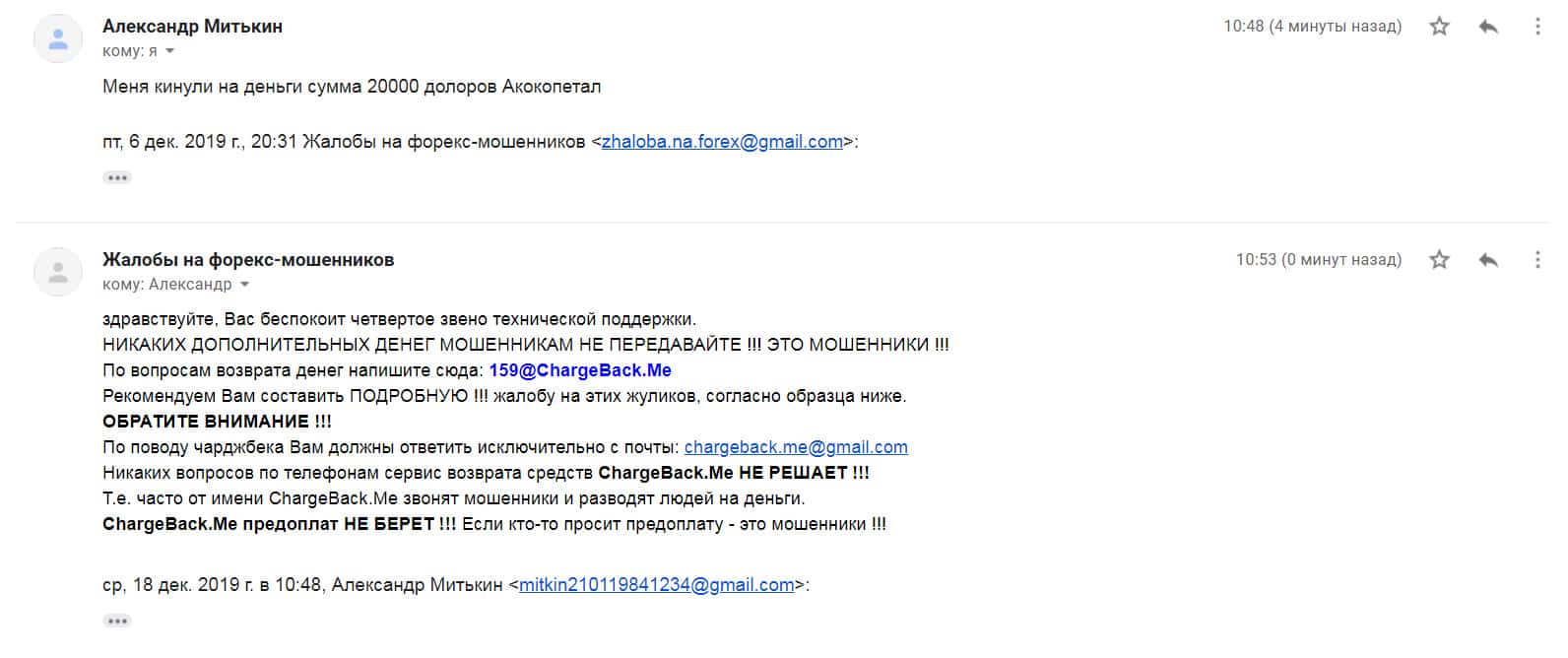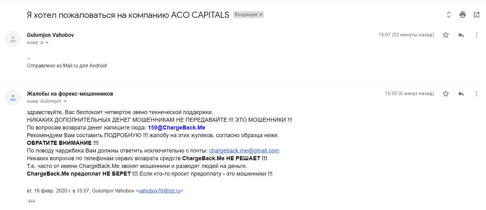 Далее представлен скриншот письма, в котором мы видим как клиент прикрепил подробную жалобу на лохотрон AKoCapital.