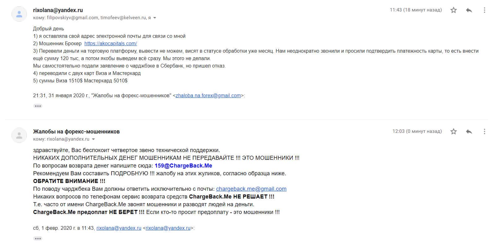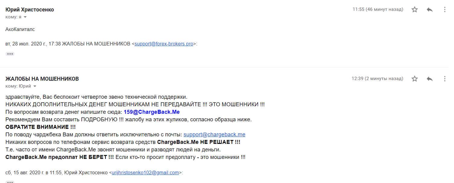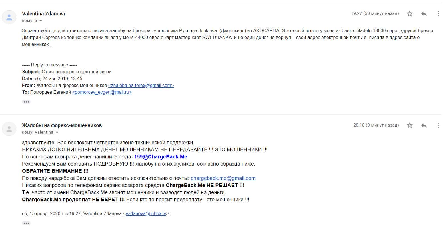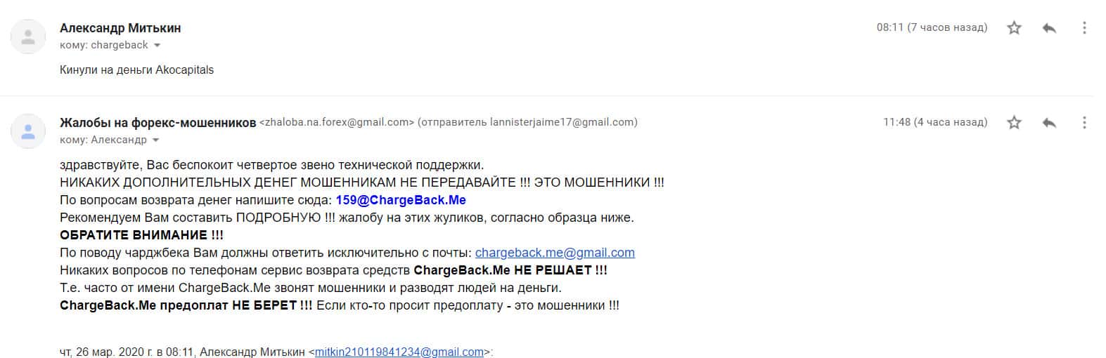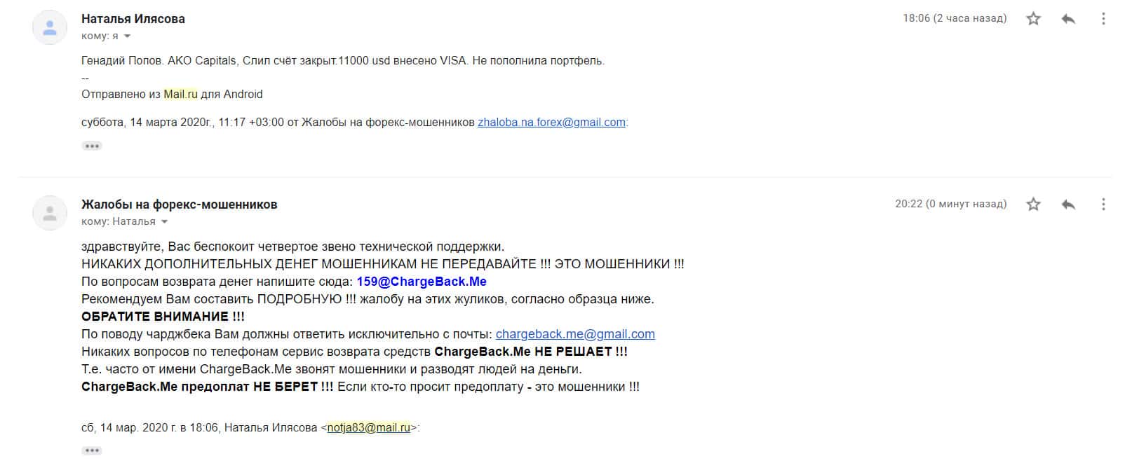 Автору последующей жалобы на мошенническую форекс-организацию Ако Капиталс также посоветовали написать в специализированную веб-службу ChargeBack.Me где возможно ему помогут в возврате утраченных денежных средств из-за мошенничества на FOREX.
