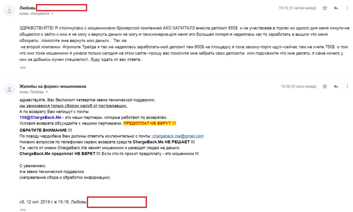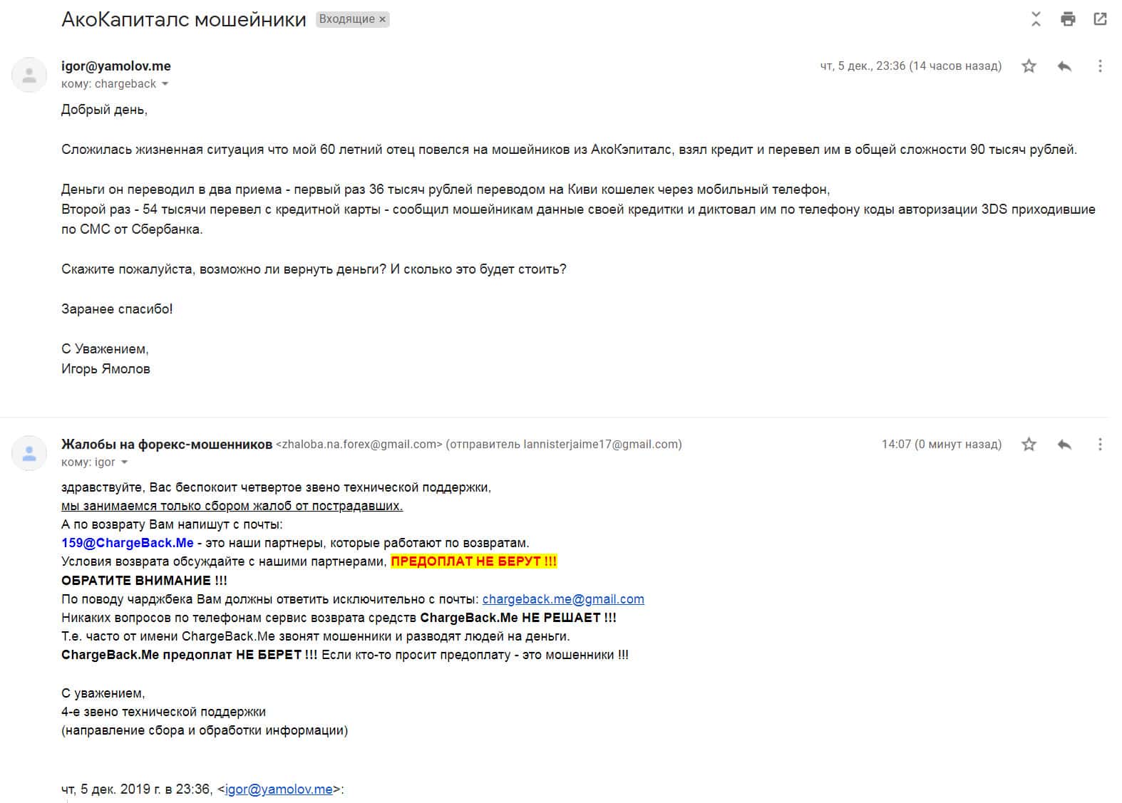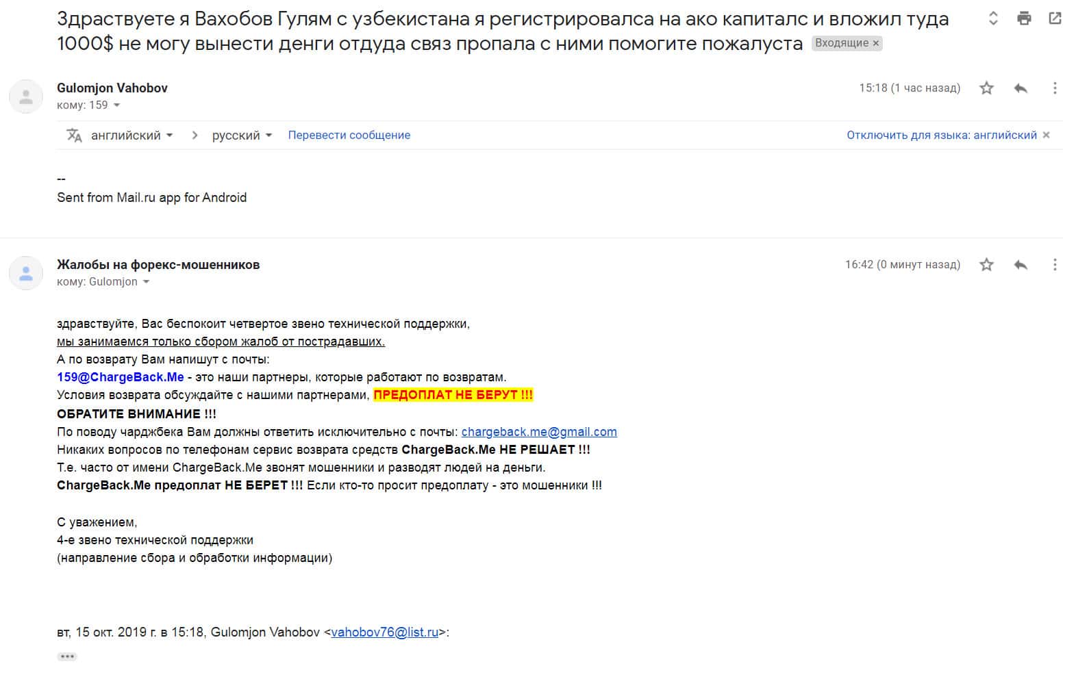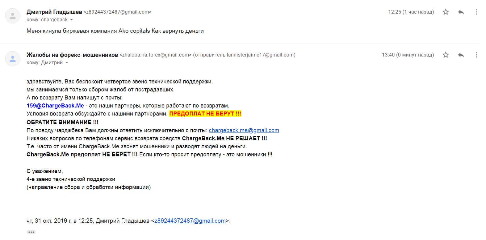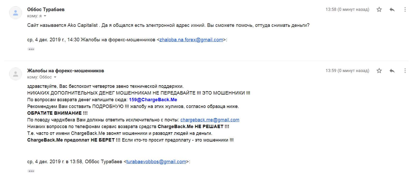 Автору последующей жалобы на мошенническую форекс-организацию Ако Капиталс также посоветовали написать в специализированную веб-службу ChargeBack.Me где возможно ему помогут в возврате утраченных денежных средств из-за мошенничества на FOREX.