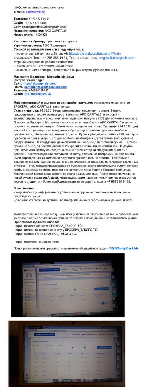 - Жалоба на мошенников в лице брокерской компании Ako Capitals