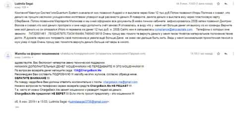 Одна женщина рассказала историю в которой она вляпалась в кухню Квантум Систем, а заодно и в лохотрон АКоКапиталс. Мошенники запудрили ей мозги и она оставила там свыше 10 000 рублей. Чтобы решить вопрос с выводом, клиентке пришлось написать все подробности в компанию ChargeBack.Me где работают профессионалы.