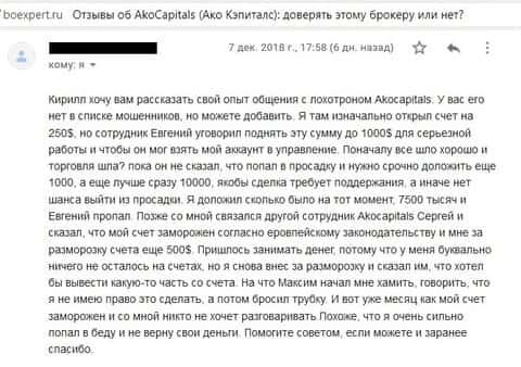 На почтовый адрес специализированной интернет-площадки, занимающейся разоблачением разных онлайн-лохотронов, пришло письмо с жалобой от очередного пострадавшего клиента кухни Форекс Ако Капиталс, обманутый клиент сообщил об утрате примерно 5 тысяч американских долларов.