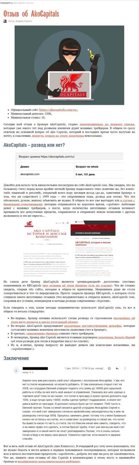 На следующей публикации размещено еще одно письмо от пострадавшего клиента мошеннической организации AkoCapitals.