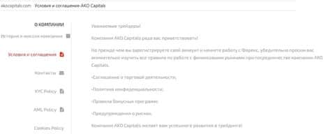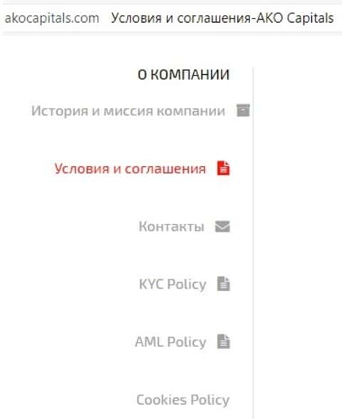 Из всей воды более менее напоминают документацию Условия и соглашения. Зайдя туда, вас ждёт по истине цирк. Все документы, приведённые там – это просто их названия. Да, вы поняли правильно. Это не гиперссылки, это просто названия документов, которые жулики АкоКапиталс просто скопировали с Интернета. На самой сайте их днём с огнём не сыщешь.