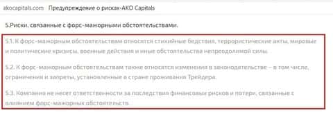 Единственную информацию об условиях "сотрудничества" нам удалось найти только в предупреждении о рисках. Как и стоило догадываться, мошенники АкоКапиталс снимают с себя ответственность при форс-мажорах (которые сами могут и организовать, ведь чёткого определения понятия форс-мажор попросту нет).