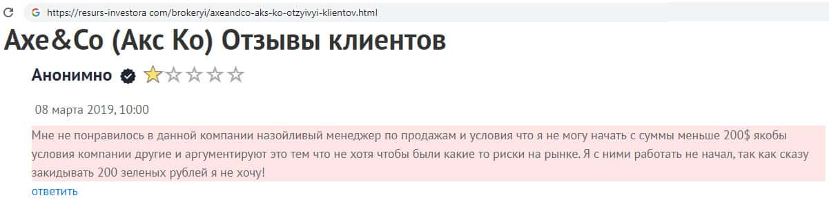 На веб-портале resurs-investora com замечен отзыв о том, как мошенники Аксе и Ко зарабатывают на пользователях своего сайта. Назойливый менеджер по продажам скам-компании AXE-CO Com уведомил автора данного отзыва о том, что первоначальная сумма для инвестиций на их сайте составляет 200 долларов.