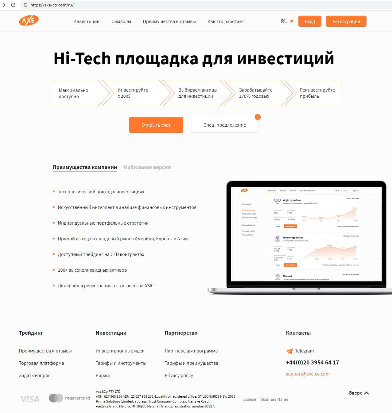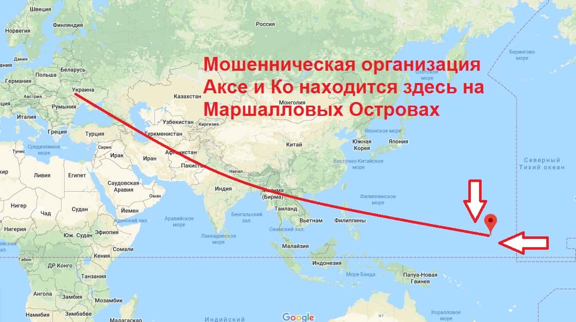 Данный интернет-лохотрон под названием Аксе и Ко принадлежит юридическому лицу, находящемуся в одном из оффшоров на Маршалловых Островах, где зарегистрировано немалое количество подобных организаций. Это не дает им право предоставлять свои инвестиционные услуги на территории Российской Федерации.