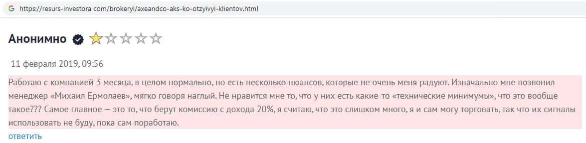 На веб-сайте resurs-investora com был обнаружен комментарий о том, как шуллера AXE-CO Com наживаются на людях и берут комиссию от дохода в размере 20%. Если данная компания берет такие проценты, то в итоге клиент остается без прибыли, а возможно даже в убытке. Связываться с мошенниками Аксе и Ко не рекомендуем !!!