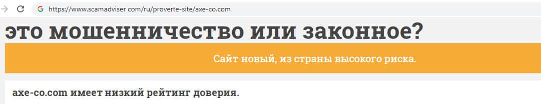 На информационном сайте scamadviser com обнаружена информация о том, что у мошеннического сайта AXE-CO Com низкий рейтинг доверия. Это прежде всего является свидетельством того, что не стоит так рисковать с вкладывать свои денежные средства в не прибыльное дело на жульническом сайте !!!