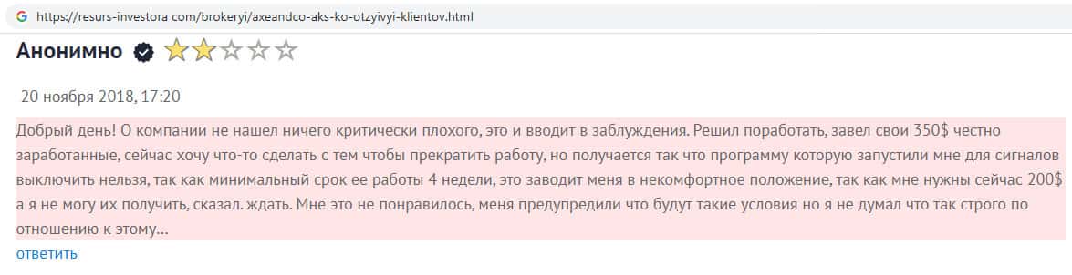 На веб-сайте resurs-investora com отыскан комментарий одного из пользователей сайта конторы Аксе и Ко, который закинул на счет 350 долларов и ждет чуда. Программа для инвестирования разработана таким образом, что 4 недели клиент сам ее выключить не сможет и поэтому вынужден в течении месяца пополнять счет, надеясь вывести баланс.