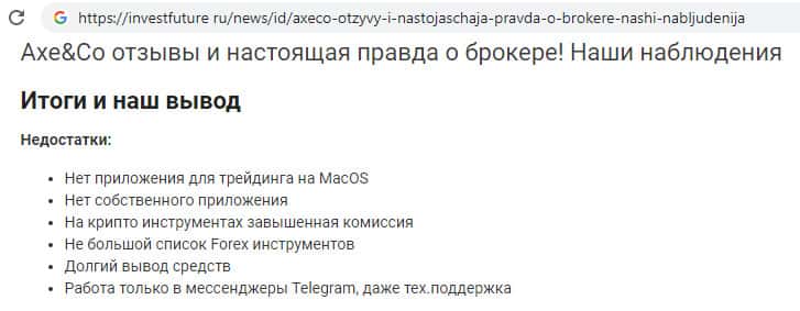 На интернет-портале investfuture ru была найдена информация о том, что на сайте скам-компании Аксе и Ко завышенная комиссия на крипто-инструментах, в действительности нет собственного приложения, долгий вывод денежных средств, а так же работа технической поддержки только в мессенджере Телеграм.