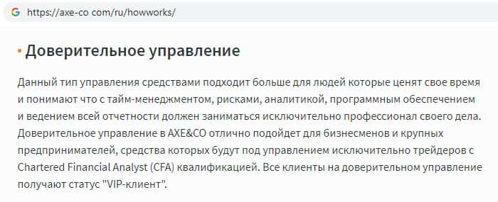 Мошенники Акса и Ко нагло врут о том, что все клиенты на доверительном управлении получают статус VIP-клиент. Данная жульническая контора не подойдет тем, кто хочет получить какую-либо прибыль. Аферисты AXE-CO Com, когда на торговом счете клиента накапливается определенная сумма денег, перестают делать выплаты и блокируют счета.