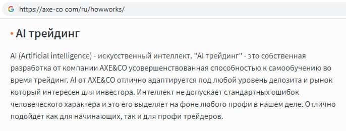 Аферисты Аксе и Ко рассказывают сказки пользователям сайта о том, что якобы существует искусственный интеллект в сфере криптовалют. Верить подобного рода информации не рекомендуем, поскольку все, что пишут шуллера AXE-CO Com - вымышленная информация не для здравомыслящих людей.