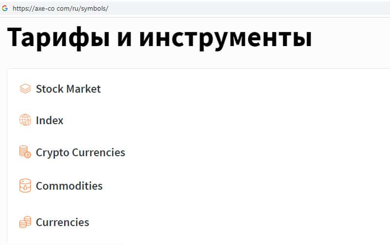Финансовые инструменты на сайте инвестиционного лохотрона AXE-CO Com
