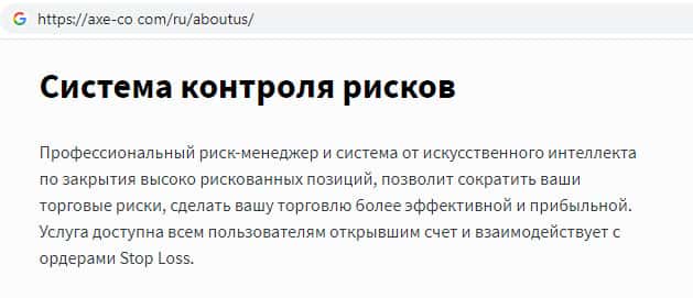 Чем больше денежных средств клиент вкладывает, тем выше риск потери денежных средств. Аферисты AXE-CO Com на своем официальном сайте указывают информацию о том, что высоко рискованные позиции на их сайте закрываются автоматически. Внимательно читайте всю информацию на сайте жуликов Аксе и Ко !!!