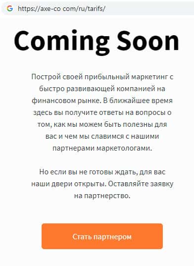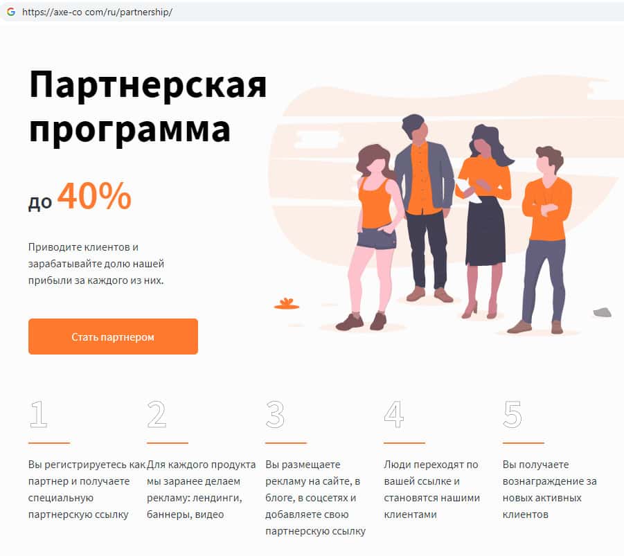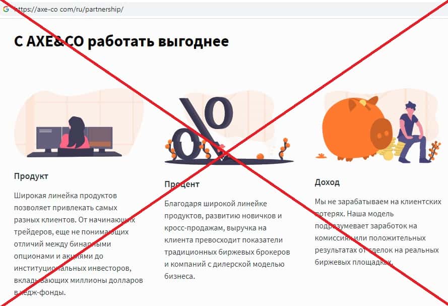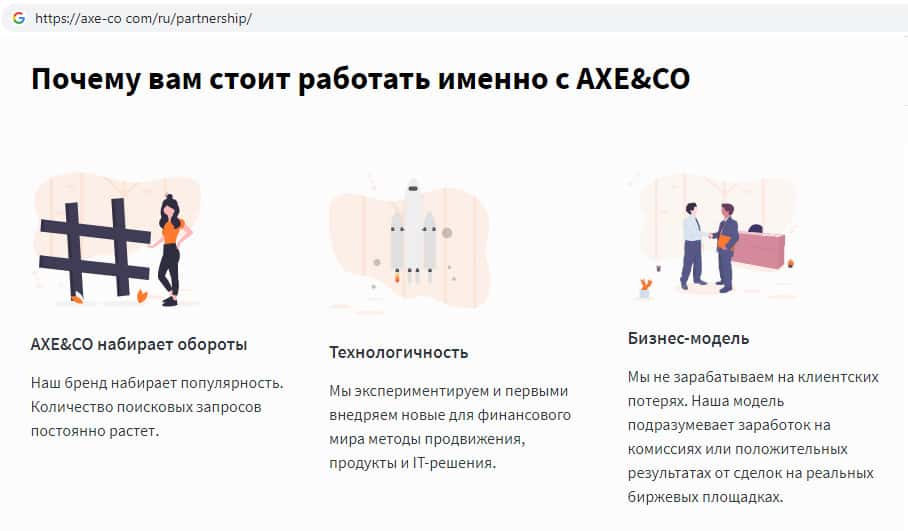 Шуллера AXE-CO Com разработали некую партнерскую программу, которая существует для привлечения как можно большего количества клиентов в их контору. Мошенники Аксе и Ко предлагают за счет этого снизить комиссию за торговлю тому, кто пригласил своего друга в данную организацию.