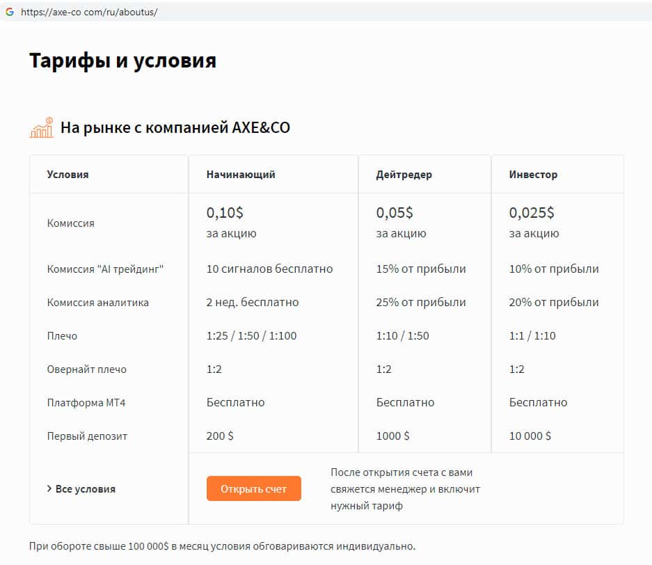 Тарифы и типы торгового счета на сайте AXE-CO Com