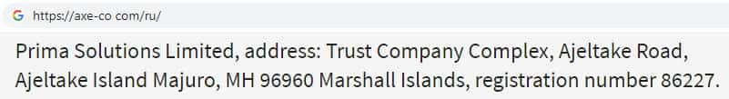- Оффшорное место регистрации скам-организации AXE-CO Com