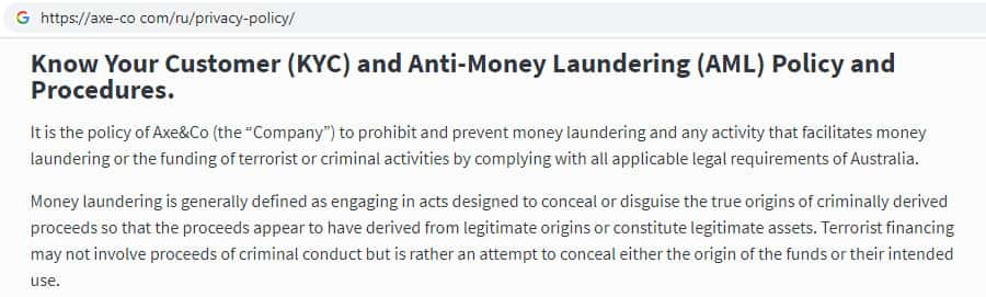 Аферисты Аксе и Ко пытаются создать видимость того, что ведут борьбу с отмыванием денежных средств. Данный документ, именно в таком виде как предоставили мошенники AXE-CO Com, имеется у каждой жульнической конторы, которая пытается доказать честность и надежность предоставления услуг своей конторы.