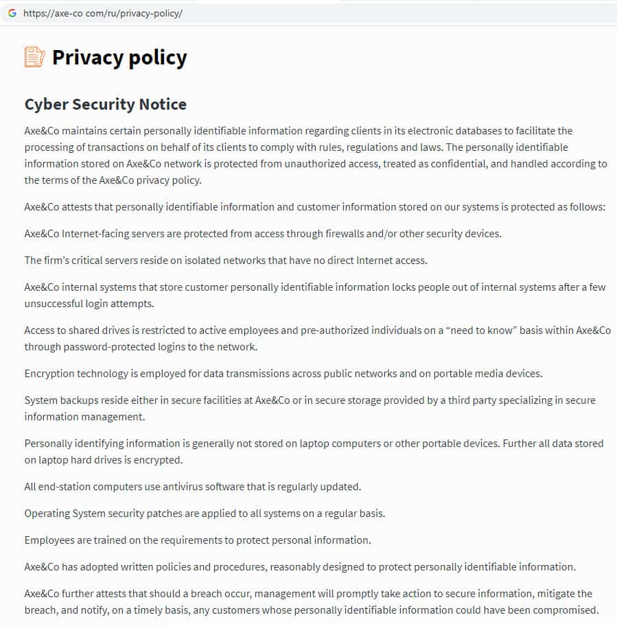 Мошенническая организация AXE-CO Com на своем официальном сайте предоставляет документ о политике конфиденциальности, который полностью на английском языке. Это означает, что сайт данной инвестиционной компании рассчитан исключительно на англоязычных пользователей.