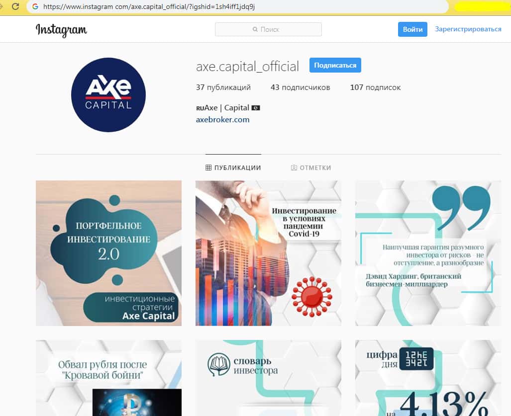 Для размещения различных заманчивых постов с лапшой на уши наивной клиентуре аферисты AxeBroker обзавелись страницей в социальной сети Инстаграм, где у мошенников Аксе Капитал имеется около 43 подписчика. На изображении, расположенном ниже, вы можете увидеть страницу аферистов Аксе Капитал на площадке Инстаграм