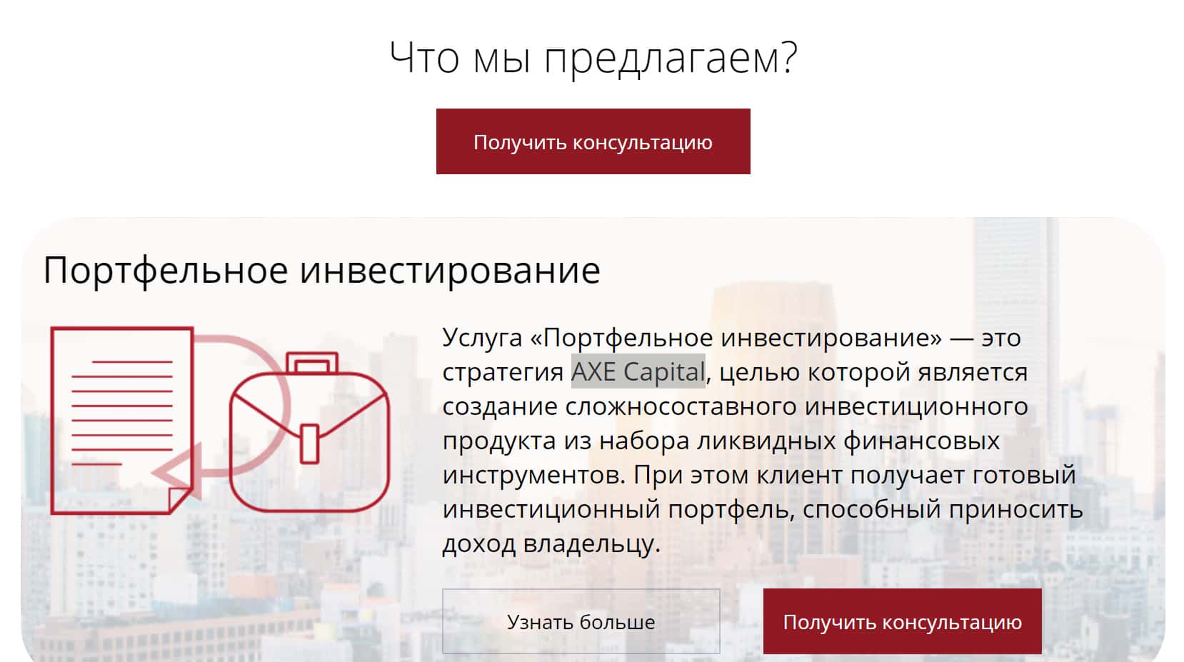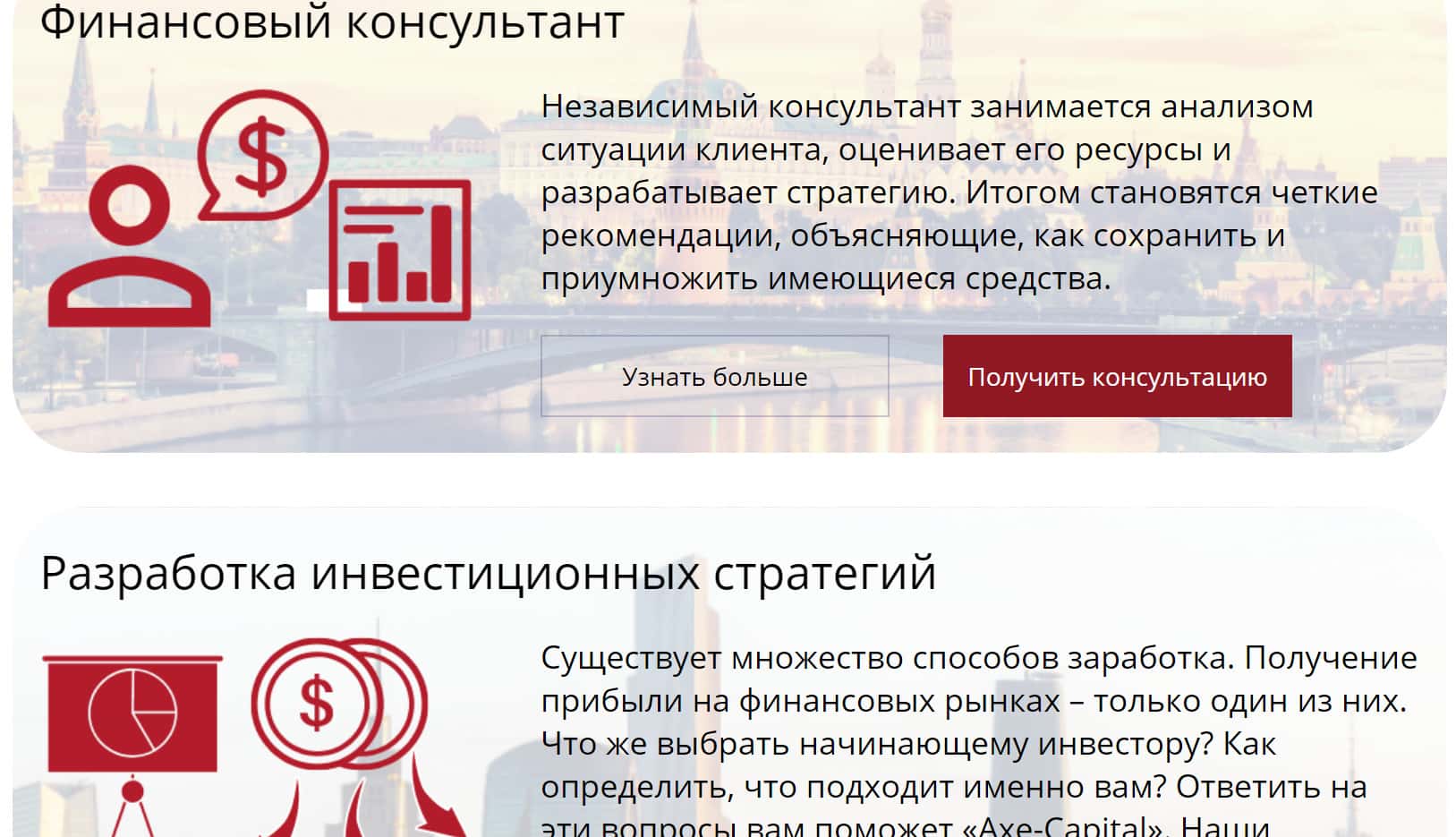 Далее на подвальном сайте у шулеров Аксе Капитал следует довольно типичный раздел, который у аферистов AxeBroker еще и создан криво, где у шулеров Аксе Капитал имеется довольно сомнительные предложения под предлогом которых жулики AxeBroker пытаются разводить на деньги наивную клиентуру.