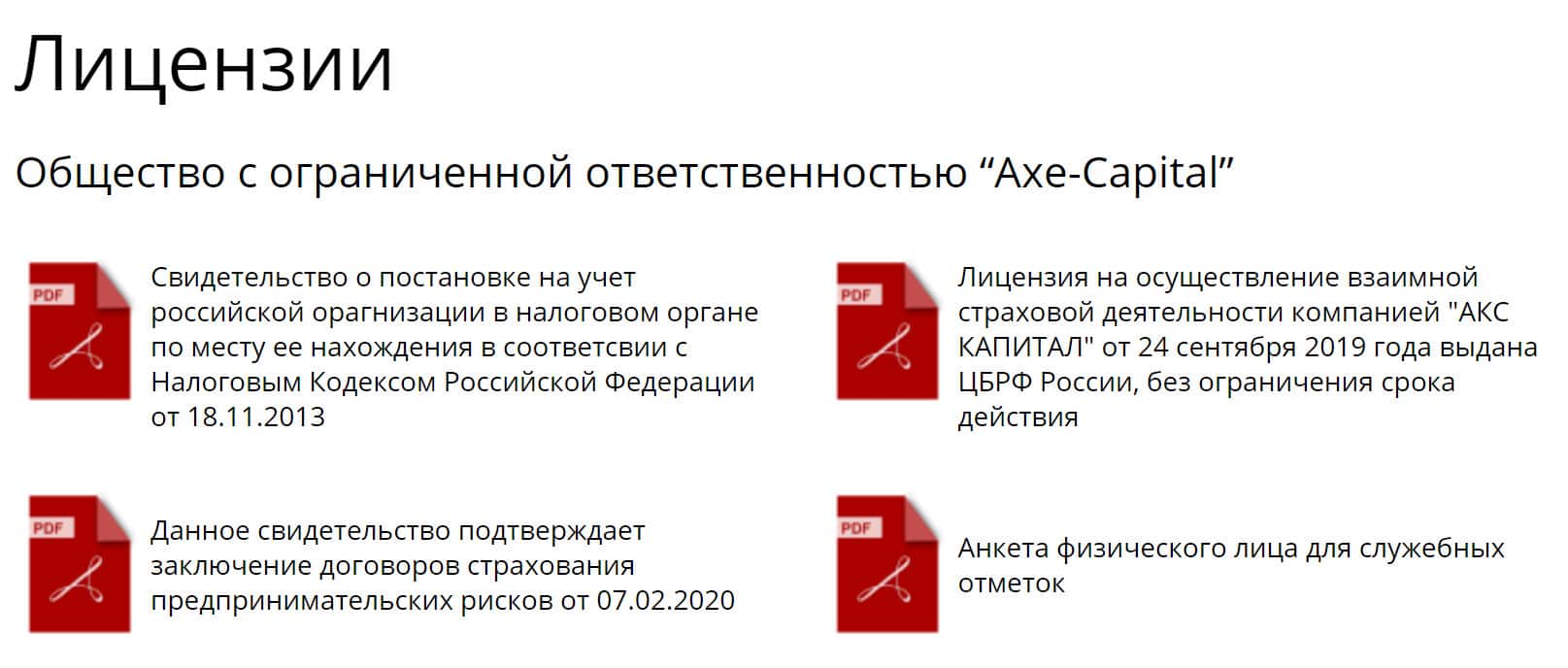 О лицензии аферисты Аксе Капитал упоминают в конце сайта, что рассчитано на расположение наивных пользователей, которые не будут вдаваться в детали мошеннической деятельности. Зато в одном из разделов они выложили несколько левых документов для отведения глаз. Большие названия и никакой конкретики.