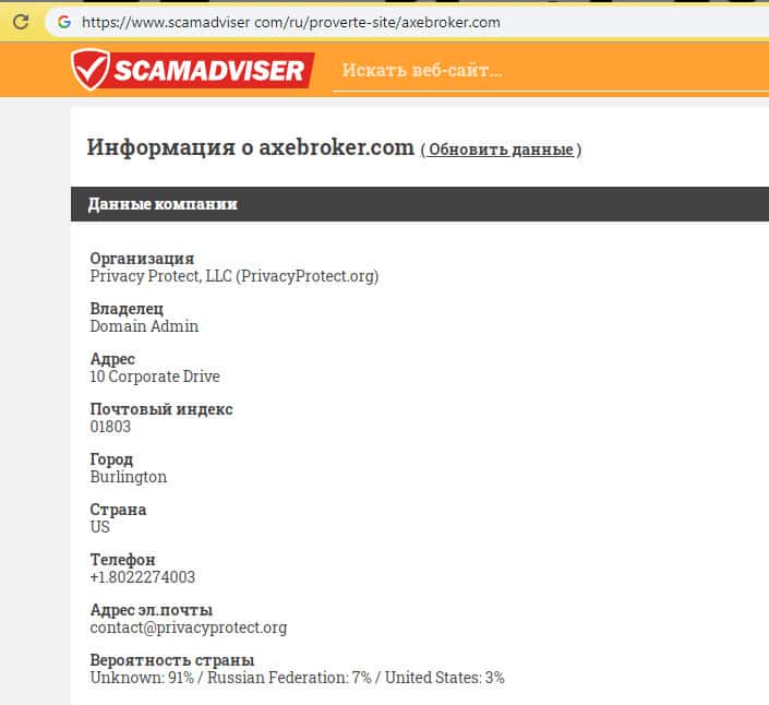 По причине мошеннической и противозаконной деятельности лохотрона AxeBroker его реальные руководители предпочитают анонимность дабы избежать ответственности со стороны правоохранительных органов. Техническая же информация найдена на портале scamadviser com, что можно увидеть на изображении, расположенном ниже.
