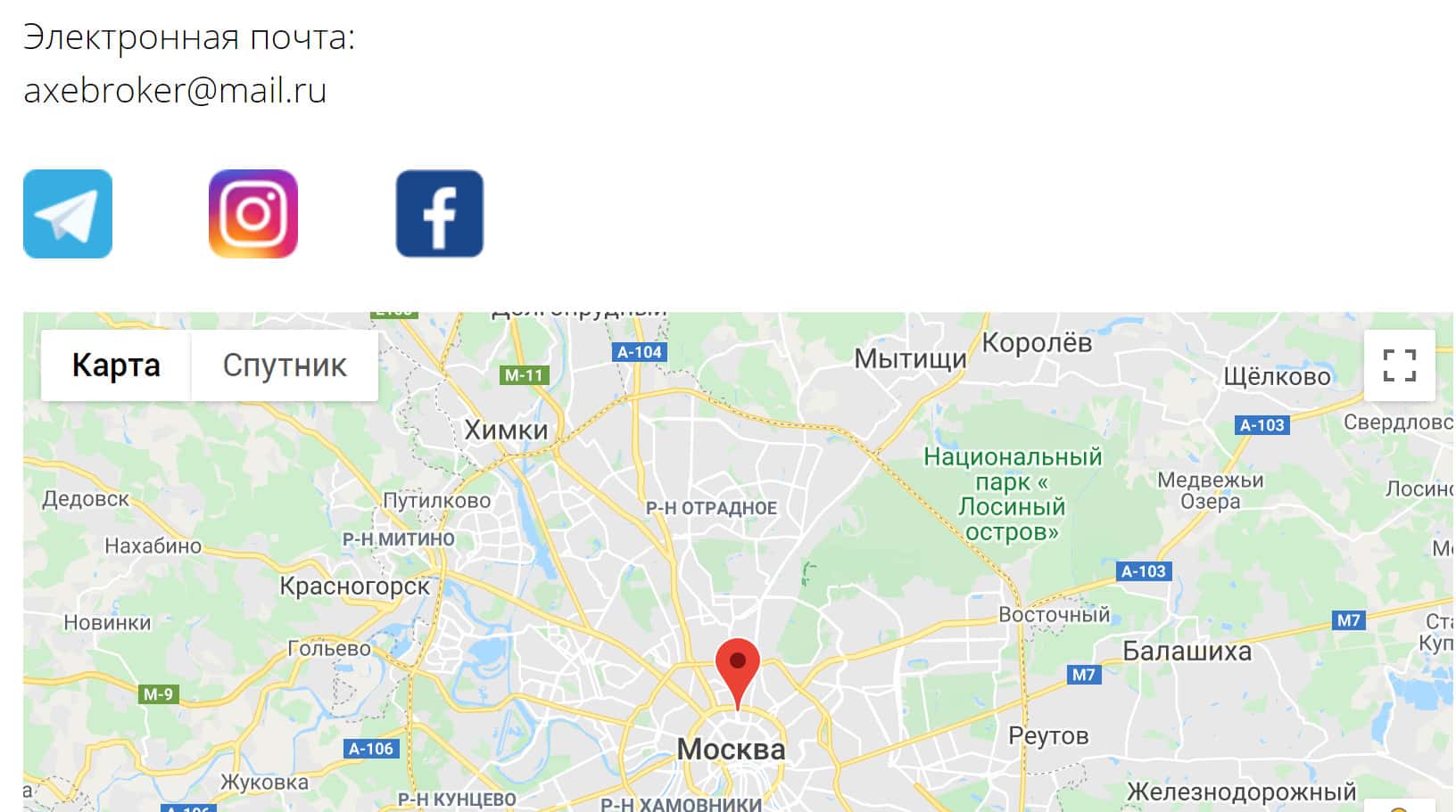 Мошенники AxeBroker не стали распыляться и предоставили клиентуре лишь телефон, адрес почты и адрес, где находится их мошенническая организация.