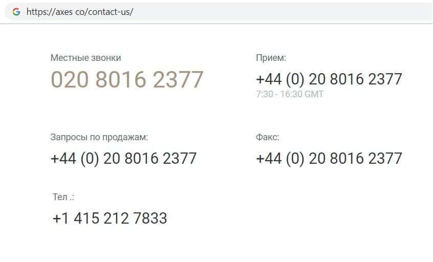 Мошенническая фирма Axes Co на своём главном сайте указала контактные номера телефонов, с которых сотрудники компании звонят клиентам и разводят их. Номера аферистов: