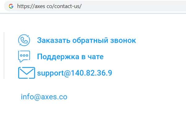 Так же фирма финансовых разводил Axes Co указала контактные адреса электронной почты, которые якобы отвечают за поддержку компании. Электронная почта разводил: