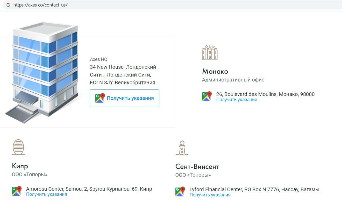Ещё фирма мошенников Axes Co указала адреса своих фальшивых адресов. Аферисты указали фальшивые адреса, так как на самом деле у компании нет офисов. Адреса кидал: