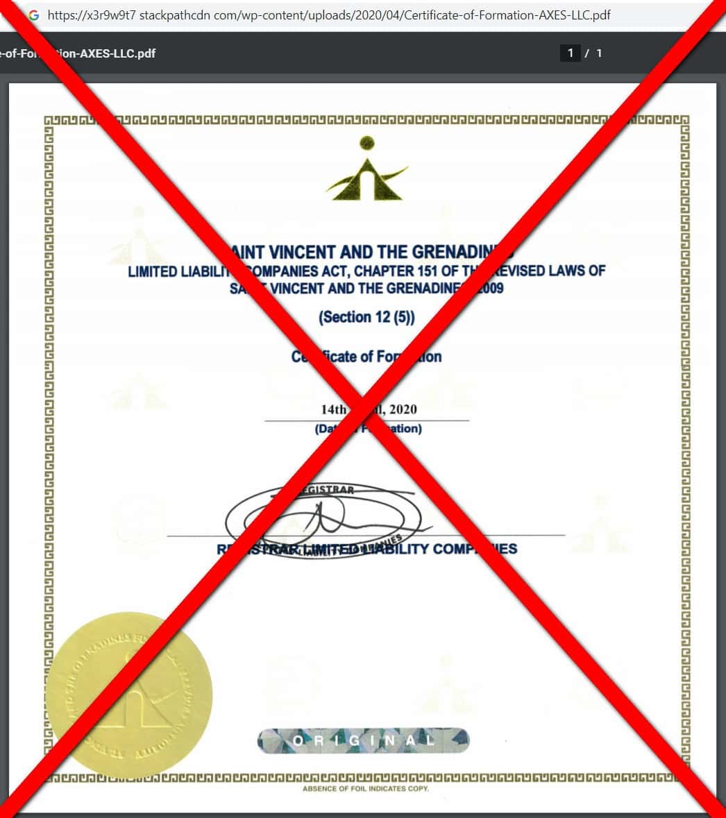 Лохотрон Axes Co на своём главном интернет ресурсе представил клиентам лицензию, которая является фальшивой и ничего не гарантирует клиентам мошеннической фирмы.