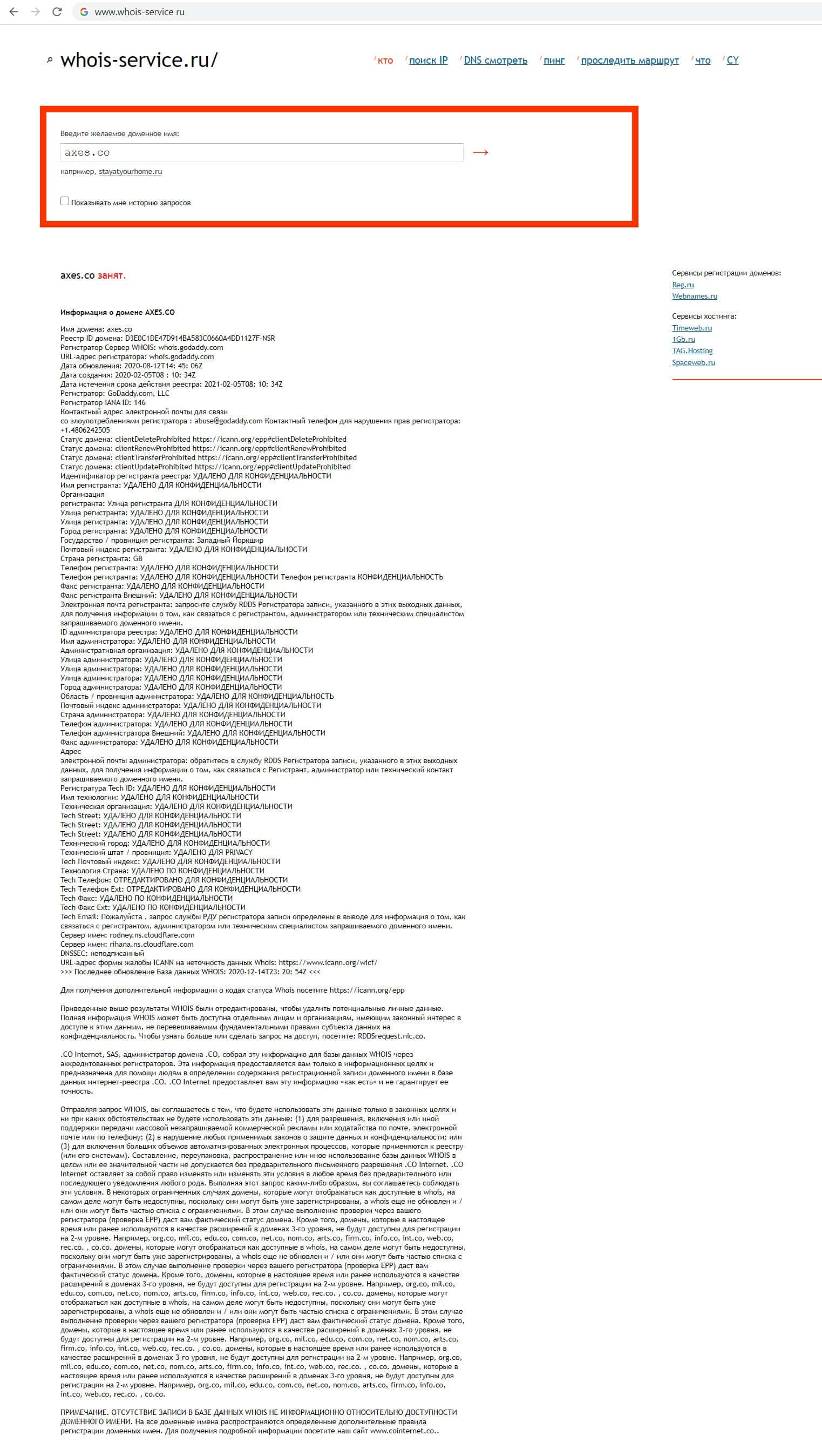 Мы хотели узнать, кто владеет доменным адресом финансовых кидал Axes Co через сайт whois-service ru. Но оказалось, что финансовые аферисты скрывают владельца своего домена.
