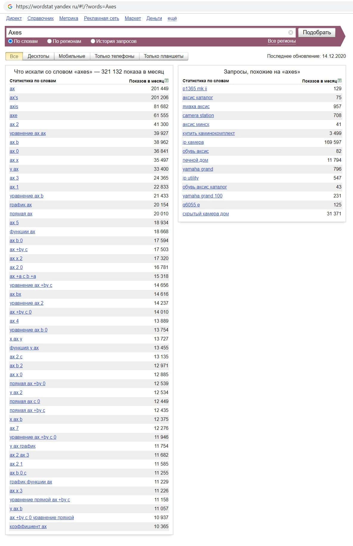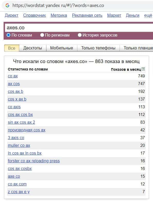 Мы проверили количество запросов компании мошенников Axes Co в Яндексе по названию фирмы, а именно "Axes". 321132 раза пользователи совершили данный запрос за месяц.
