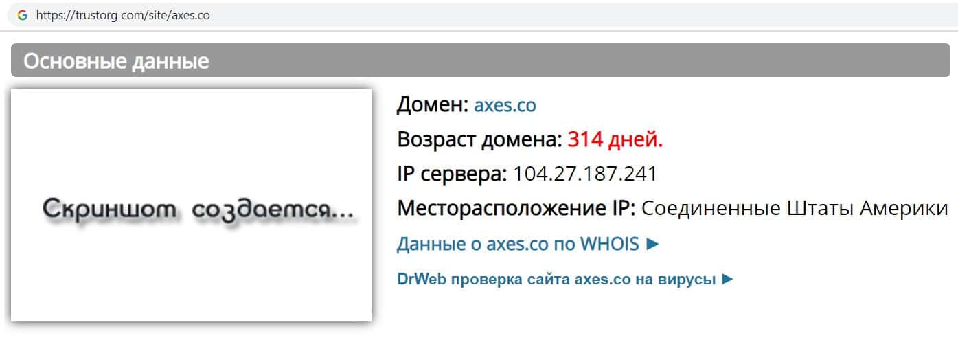 Несмотря на то, что фирма кидал Axes Co говорит о своём большом опыте работы, через сайт "Доверие в Сети" мы узнали, что контора махинаторов существует менее одного года.