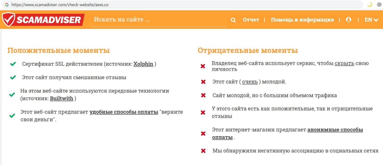 Мы проверили сайт кидал Axes Co через сайт scamadviser com. Оказалось, что данный сайт предлагает анонимные способы оплаты, а его владелец скрывает свою личность.
