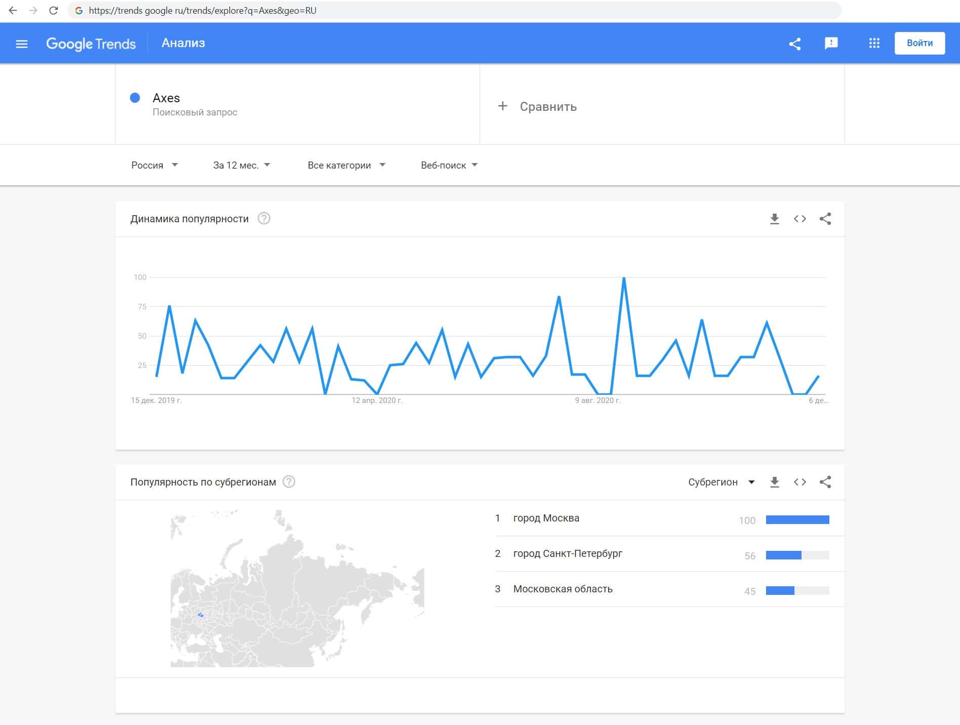 Мы проверили количество запросов компании кидал Axes Co в Google по названию конторы, а именно "Axes". Данный запрос чаще всего совершают жители Москвы.