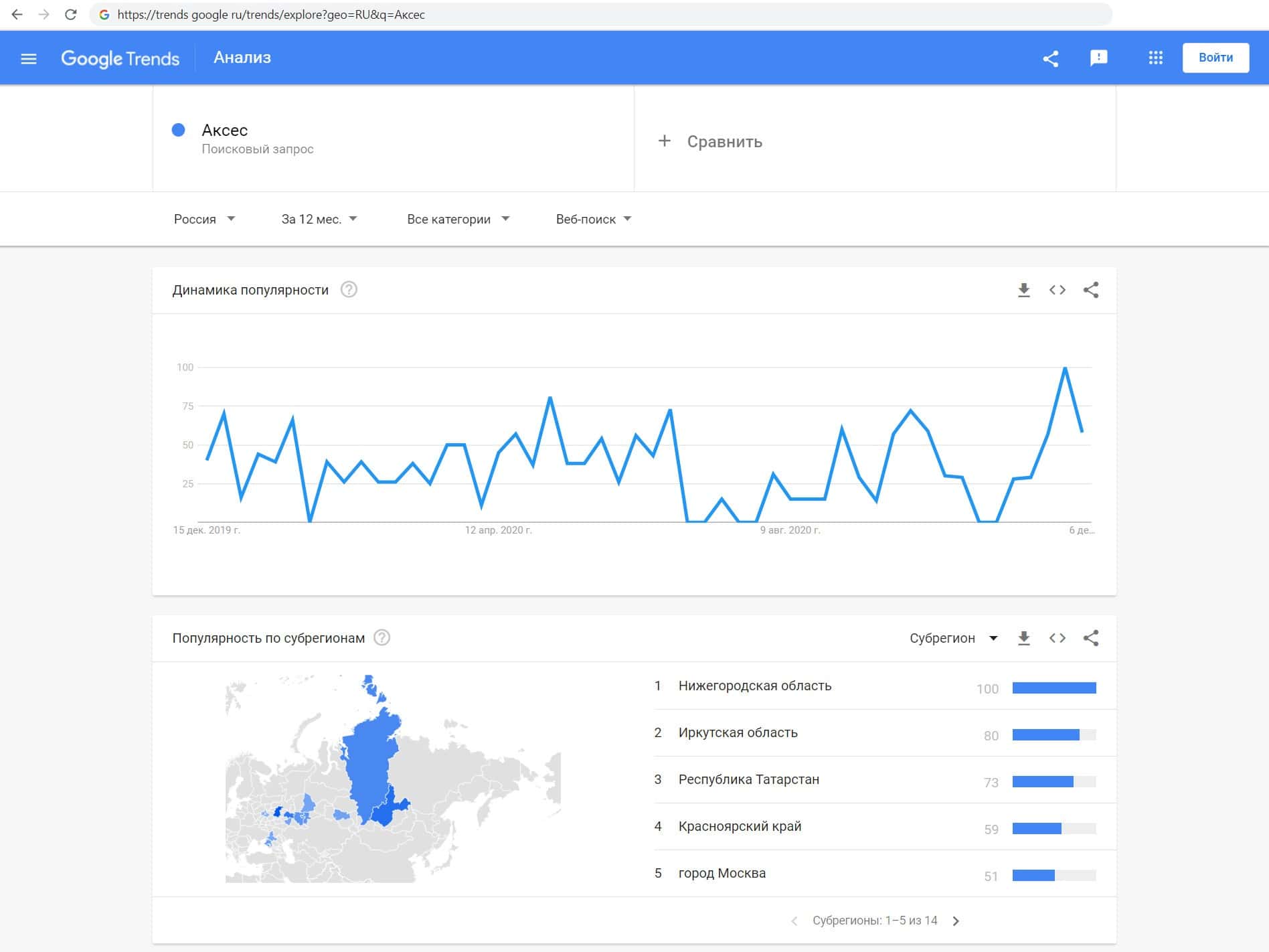 Мы ещё проверили количество запросов Axes Co по русскоязычному названию компании, а именно "Аксес". Больше всего данный запрос выполняли из Нижегородской области.