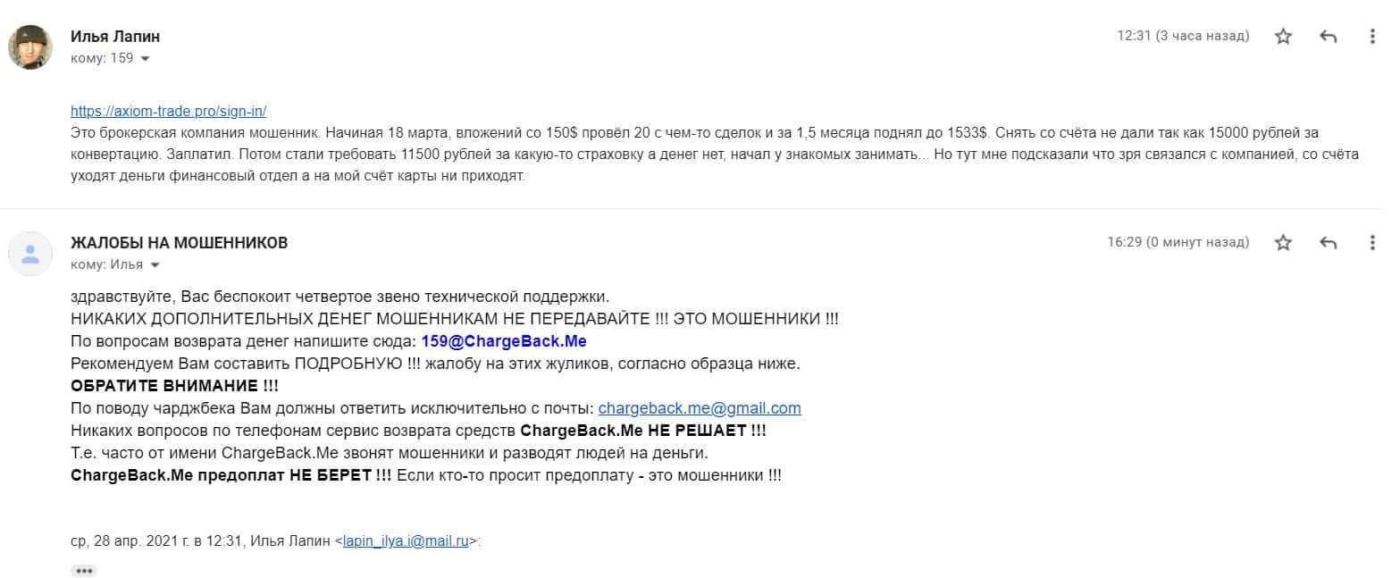 На почтовый адрес сайта по сбору информации о деятельности мошенников Форекс пришла жалоба на аферистов Аксиом Трейд, которые обманули клиента на деньги.
