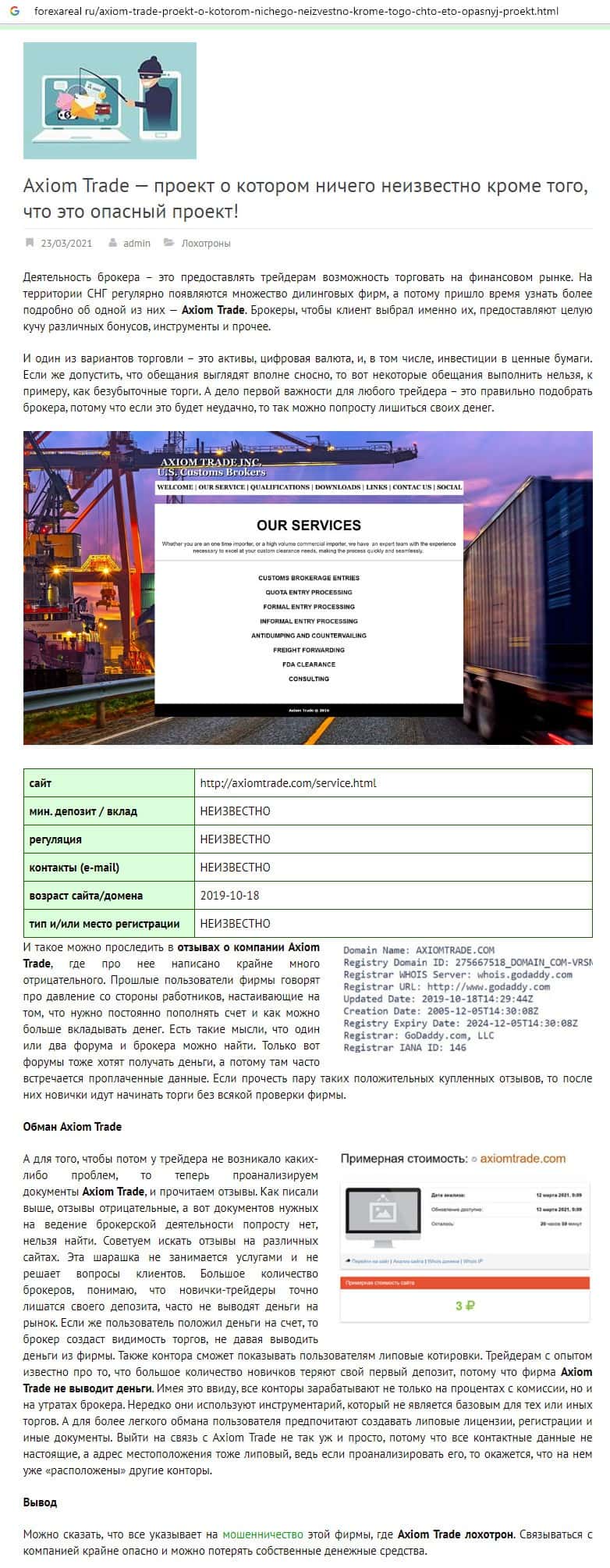 Одним из интернет-лохотронов является мошенническая организация Аксиом Трейд, которой не стоит доверять свои денежные средства и тратить драгоценное время !!!