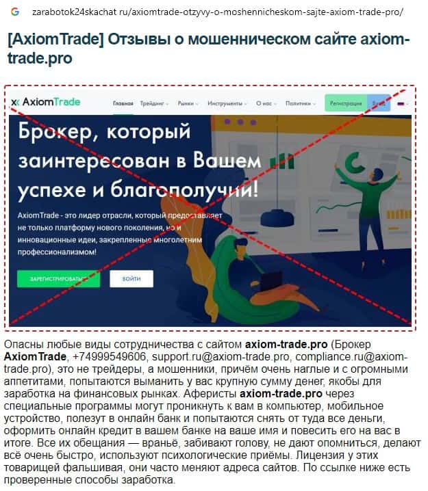 Далее предоставлена информация о фальшивом брокере Axiom Trade, который лишь вешает лапшу на уши людям о невероятной прибыли в качестве приманки.